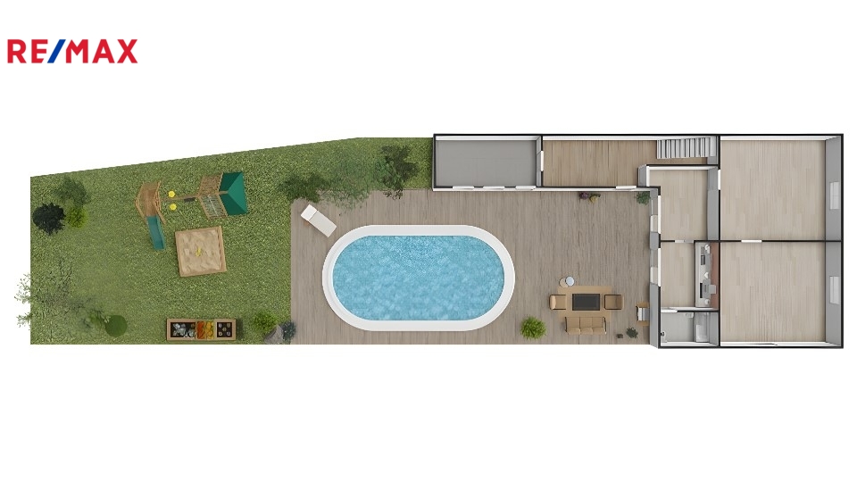• Zahrada s dostatkem prostoru pro relaxaci, dětské hřiště, pěstování zeleniny
