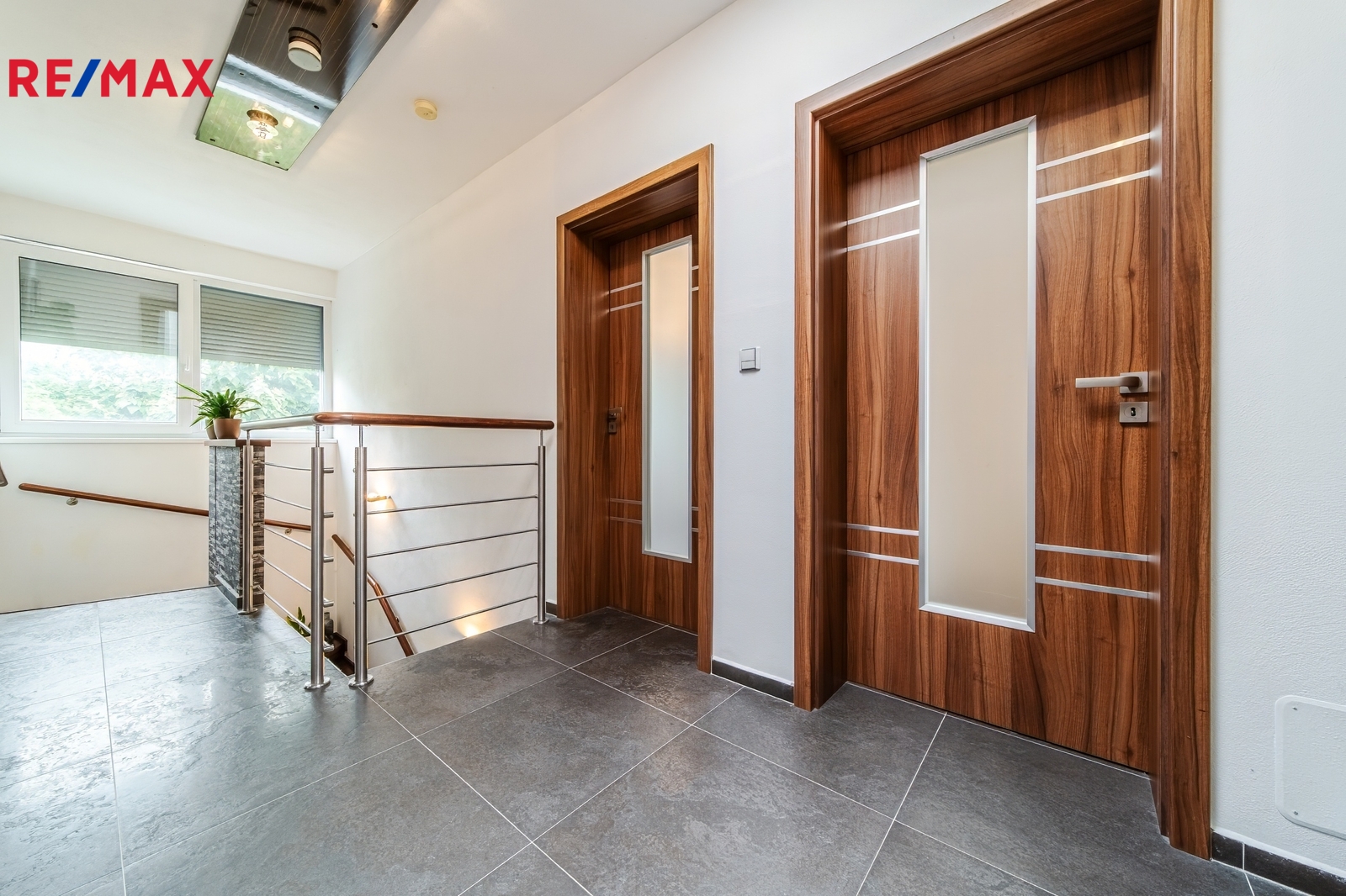 Okna a dveře: plastová (trojskla), předokenní elektrické rolety, dveře dřevěné