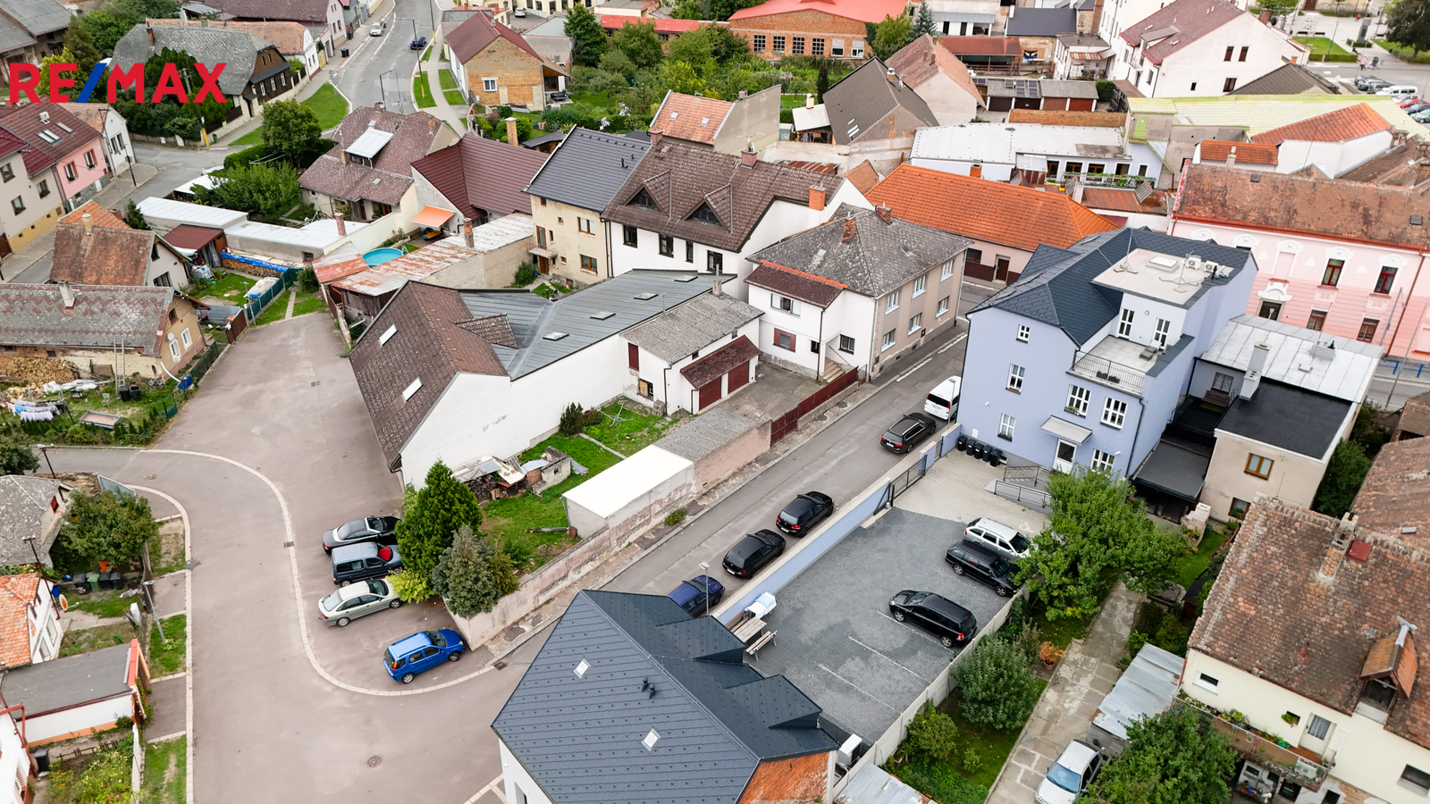 Rodinný dům je situovaný jakožto rohový v řadové zástavbě na rovinatém pozemku o celkové výměře 483m2, skládá se celkem ze tří parcel. Dům zaujímá v rámci obce strategickou polohu v centru města, má vynikající viditelnost z hlavní komunikace s přímou návazností na centrální plochy obce a splňuje tak požadavky jak na bydlení s výbornou dostupností obchodů a služeb, tak i představy investičně laděných zájemců hledajících objekty vhodné k přebudování na nájemní bydlení.