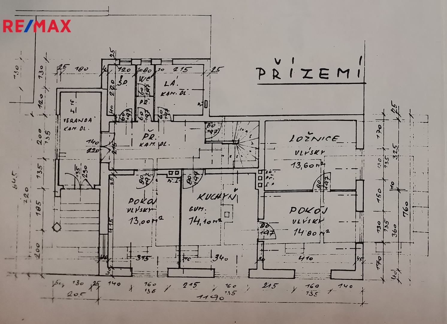 Dům jako celek lze dispozičně popsat jako 7+2, celkový obestavěný prostor je cca 902m3. Celková užitná plocha dle orientačního měření je cca 176m2 za hlavní dvě obytná podlaží + půda (při využitelnosti cca 70% = cca 63m2) + sklep cca 50% zastavěné plochy = cca 45m2. Celkem tedy cca 284m2.