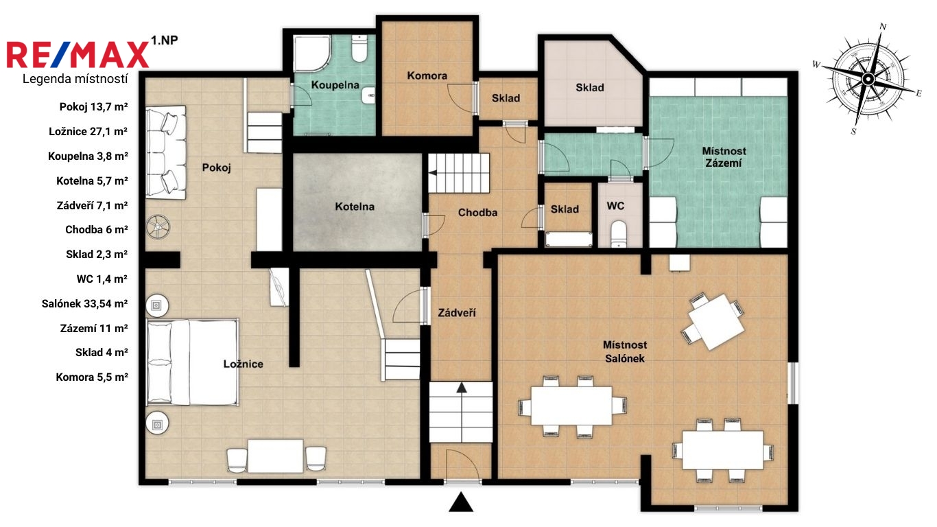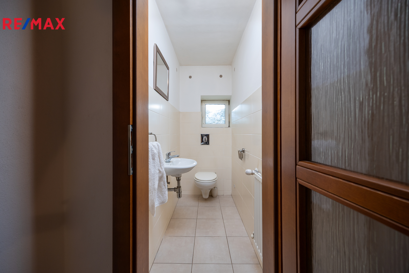 1. nadzemní podlaží: útulný apartmán, komerční a skladové prostory, samostatné WC a technické zázemí.