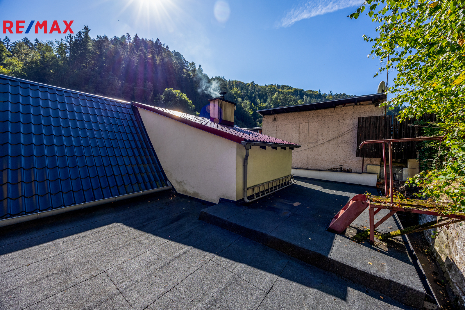 Součástí domu je také prostorná půda se vstupem na střešní terasu a zahrádku za domem.