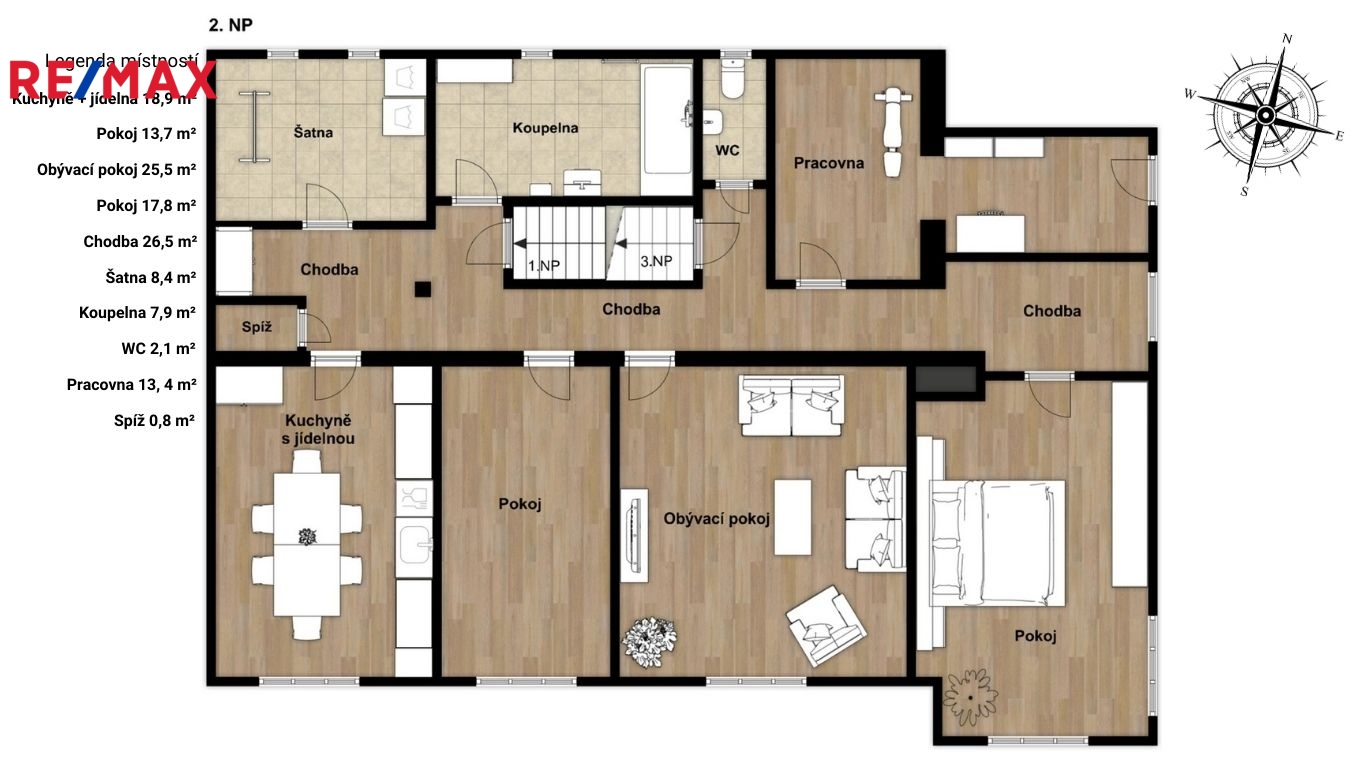 2. nadzemní podlaží: kuchyň s jídelnou, obývací pokoj, dvě ložnice, koupelna, samostatné WC, pracovna, prádelna a úložné prostory.