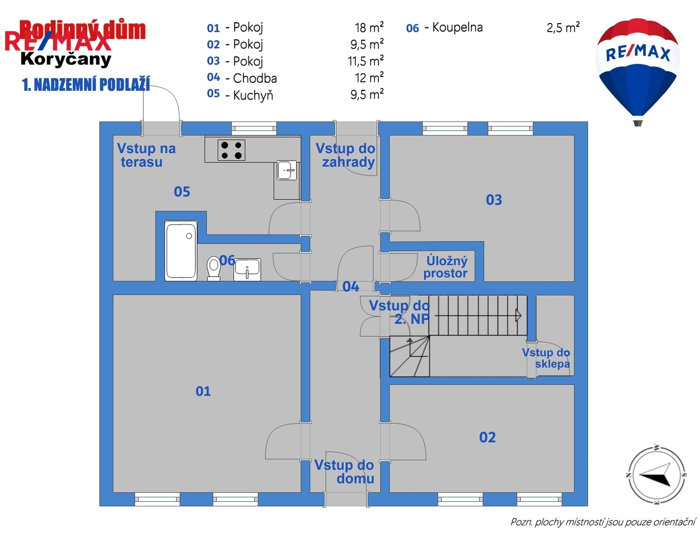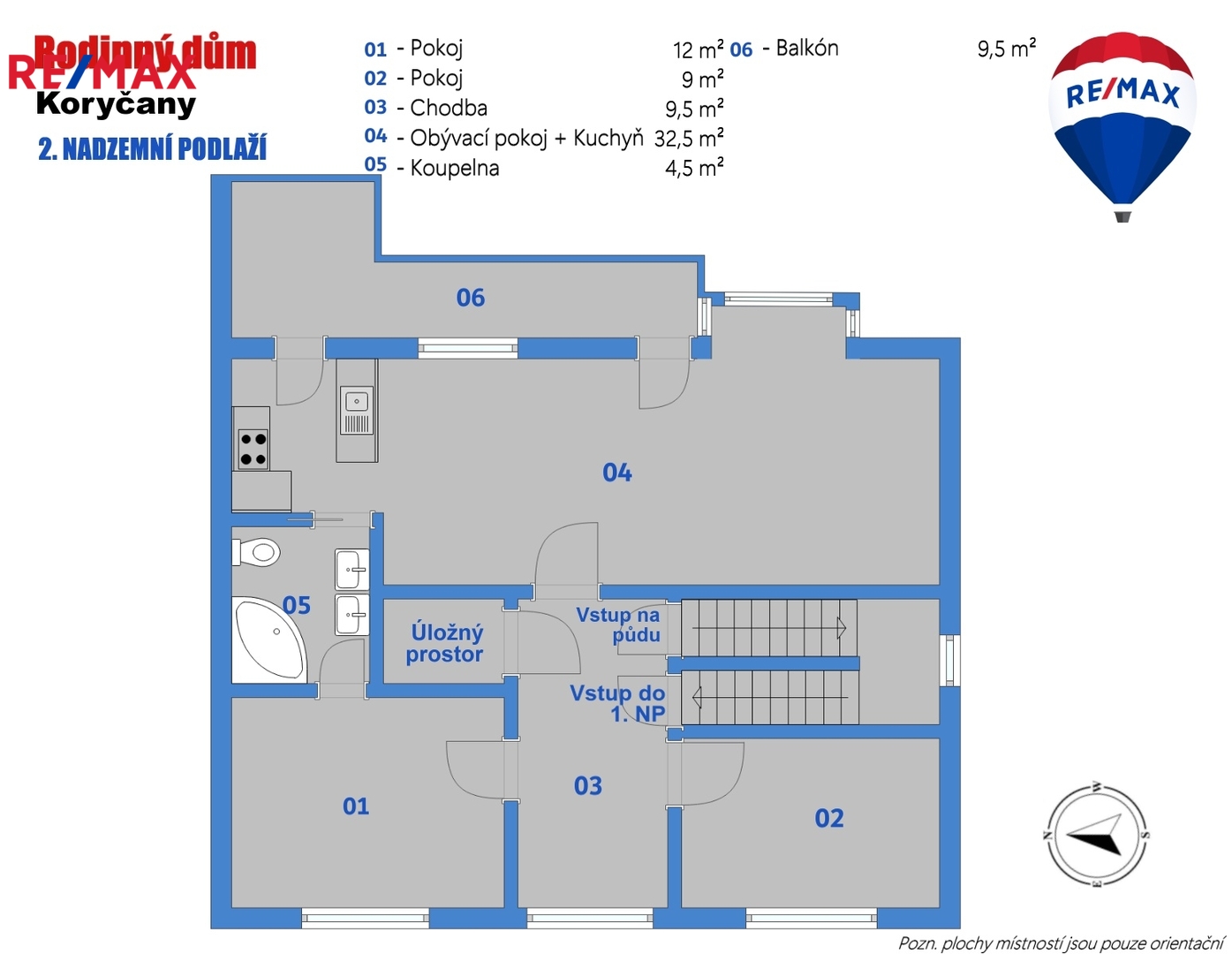 V patře je dispozice 3+kk, rovněž s koupelnou a WC.