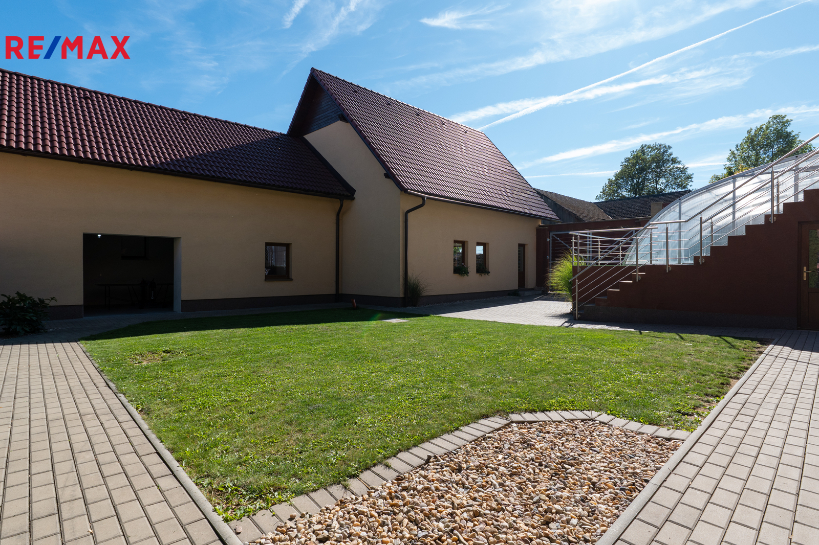 • prostorná terasa s posezením a grilem je propojená se zahradou i bazénem