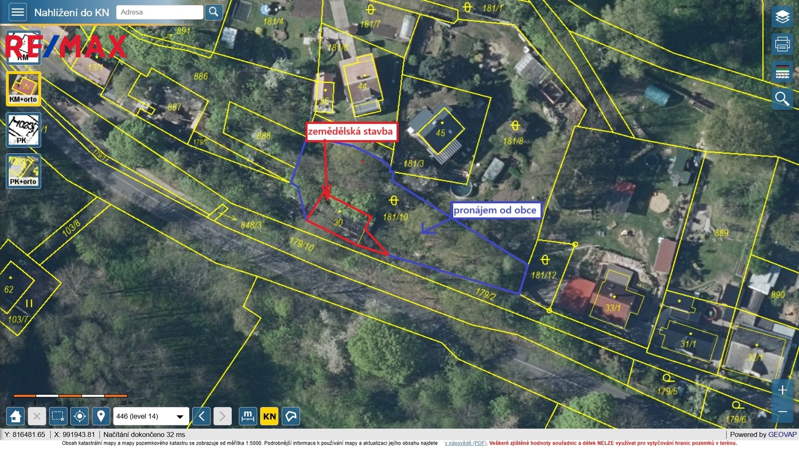 Zastavěná plocha objektem je 80m2, celková plocha pozemku 104 m2. Je zažádáno o pronájem okolního pozemku od obce, do budoucna je možný i jeho odkup. Zdi převážně kamenné a strop betonový. Krytina sundána, trámy na stržení.