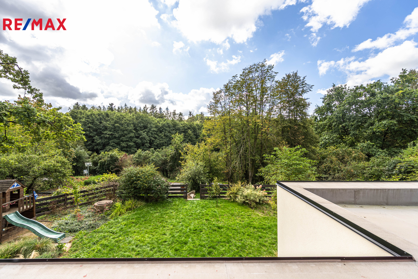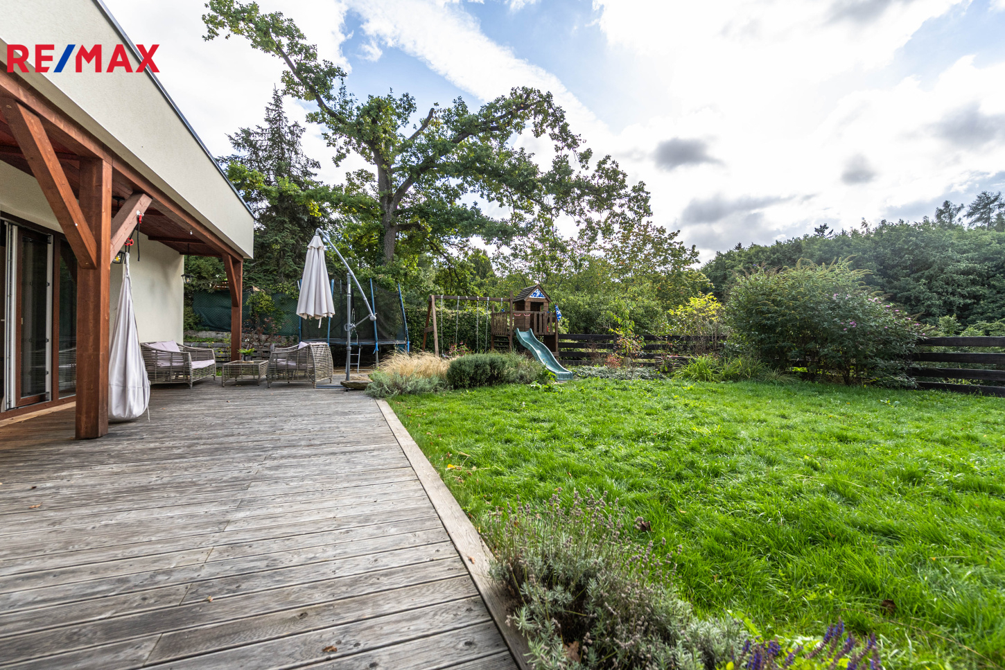 Celková plocha pozemku činí 1 160 m². Zahrada poskytuje dostatek soukromí, terasu pro posezení, je zde dětské hřiště, vzrostlé stromy a mnoho útulných zákoutí. Na pozemku je dostatek místa pro parkování několika aut.