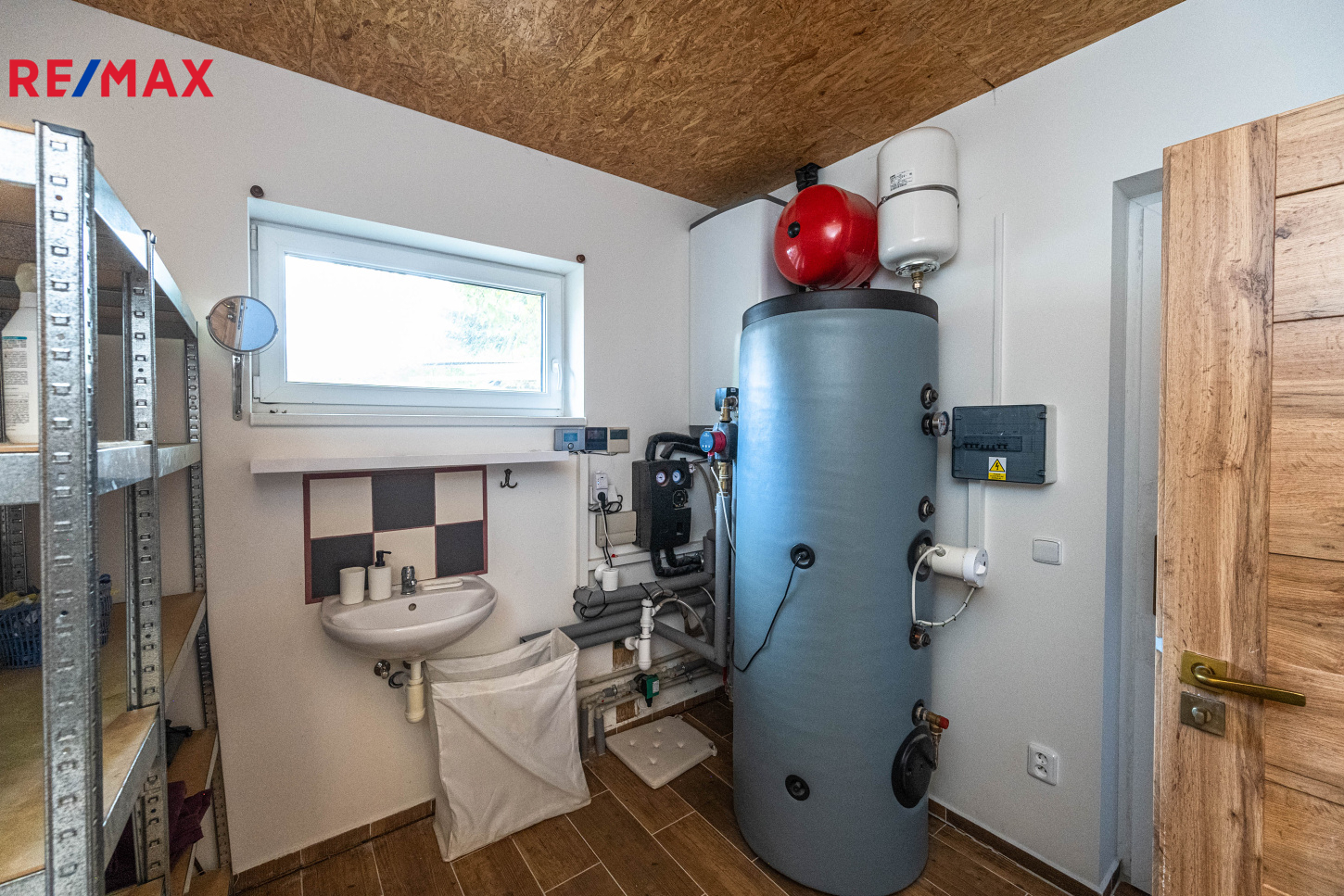 Vytápění zajišťuje tepelné čerpadlo vzduch/voda s podlahovým topením v obytných místnostech, v koupelnách jsou otopné žebříky.