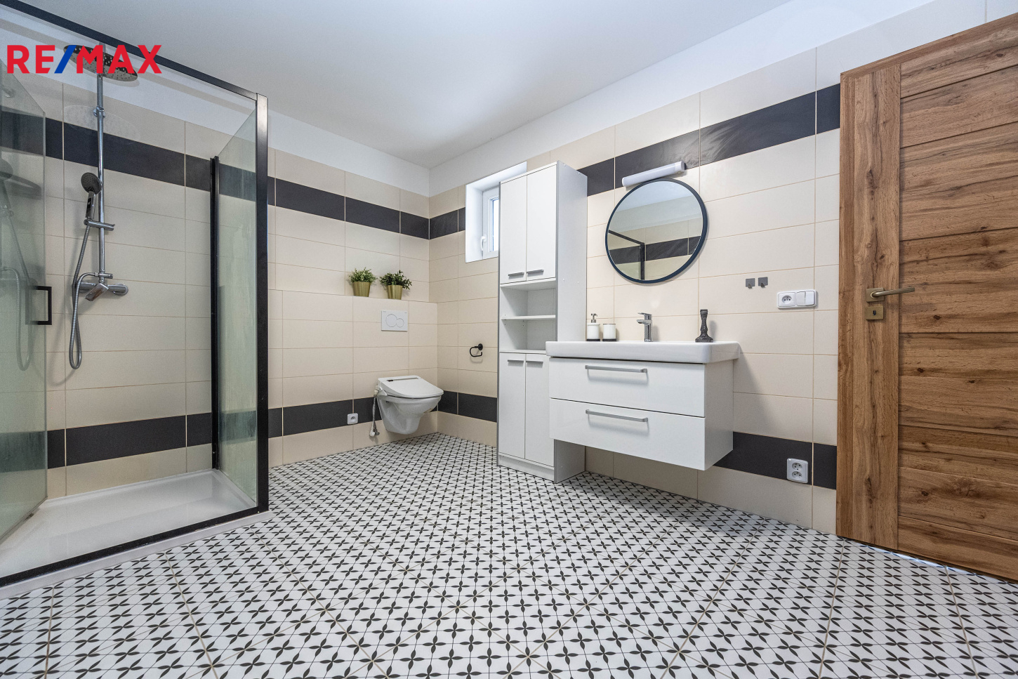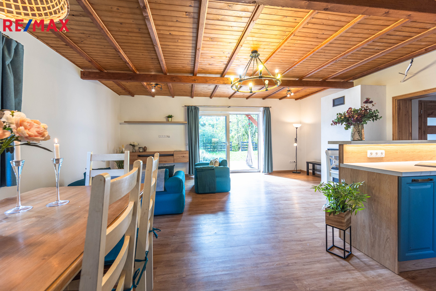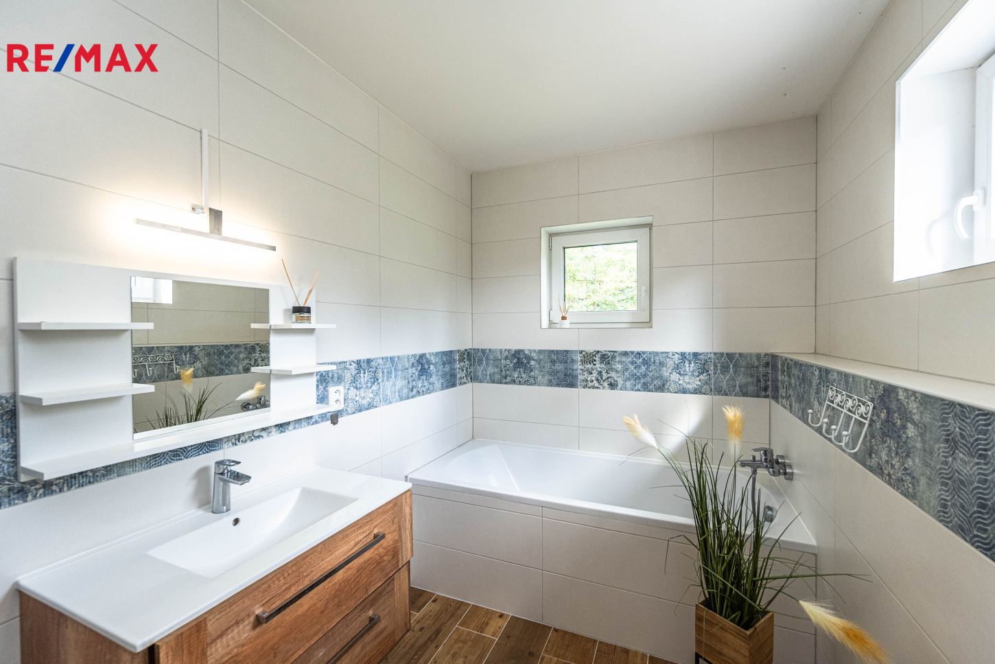 Interiér domu kombinuje kvalitní materiály, vkusné zařízení a praktické řešení – dřevěné stropy, designové koupelny, prostorné úložné prostory a vestavěné šatny.