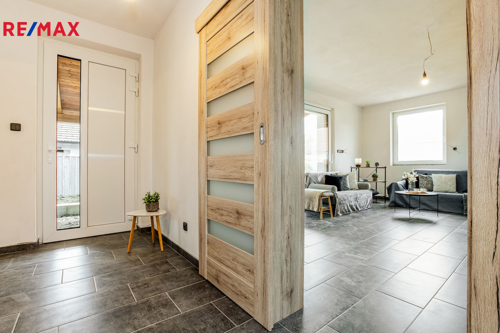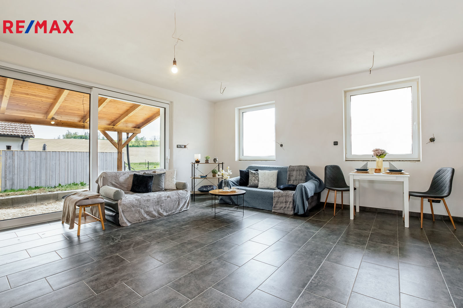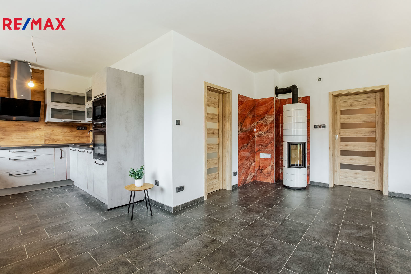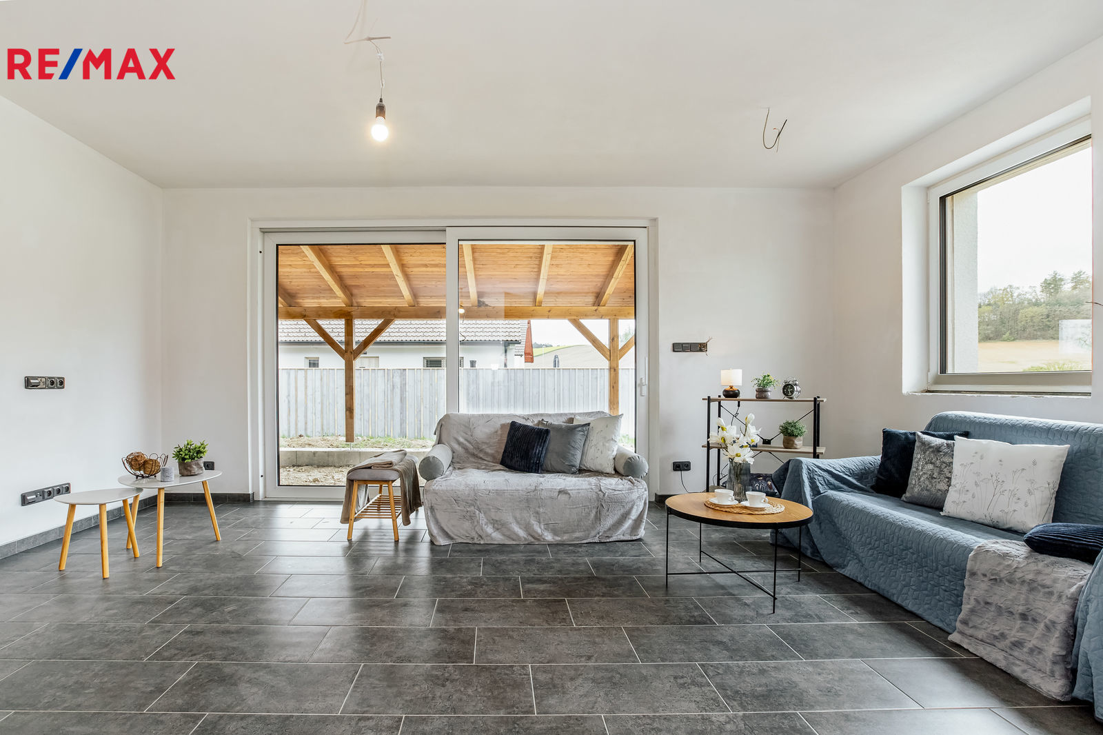 Při vstupu do nemovitosti se v přízemí ocitneme v prostorném obývacím pokoji propojeného s kuchyní a terasou.