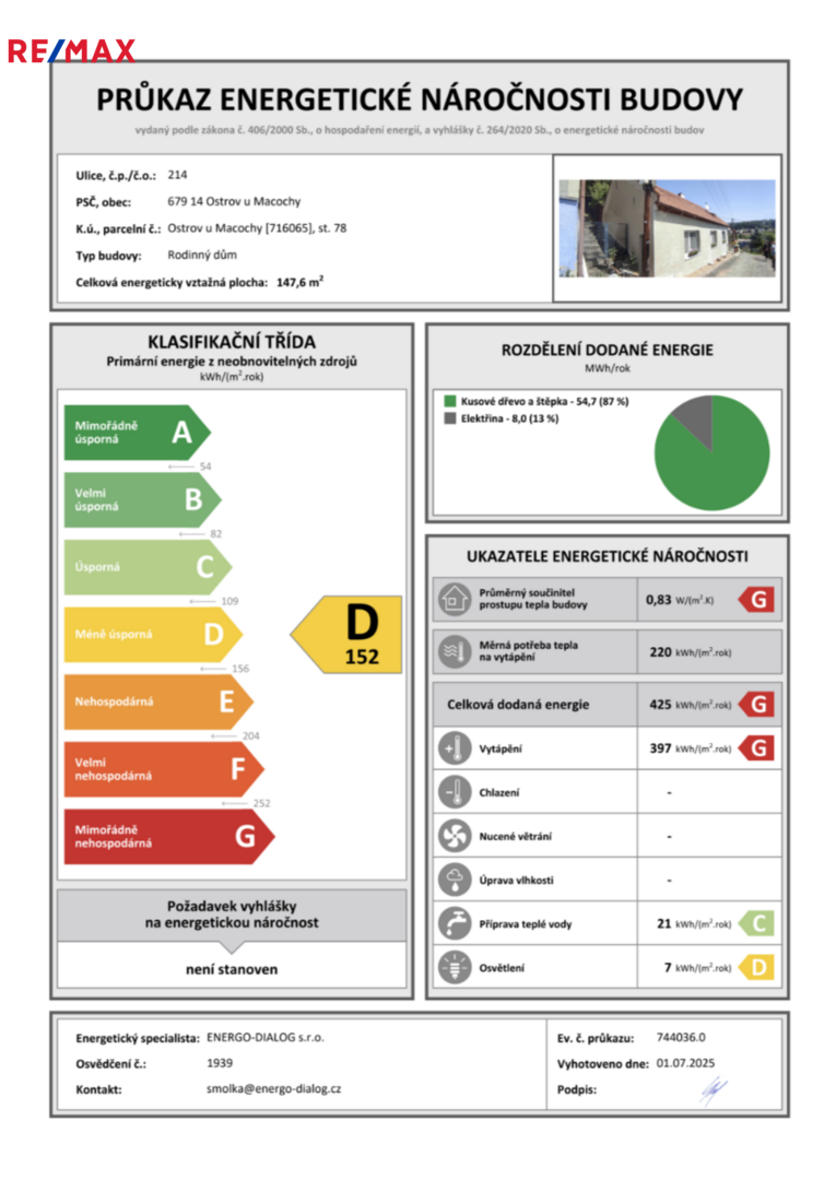 Rodinný dům 3+kk s pozemkem o rozloze 408 m² | Nemovitost je po částečné rekonstrukci vnitřků od roku 2019 | Energetická třída skupiny D | Vyžaduje další stavební zásahy, rekonstrukce a úpravy | Stavební dokumentace k předání na prohlídkách nemovitosti.