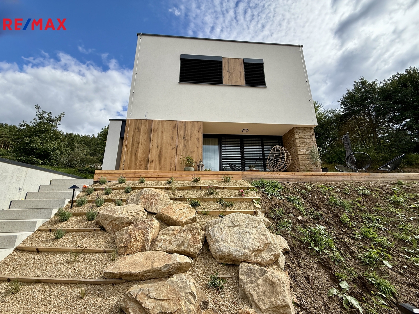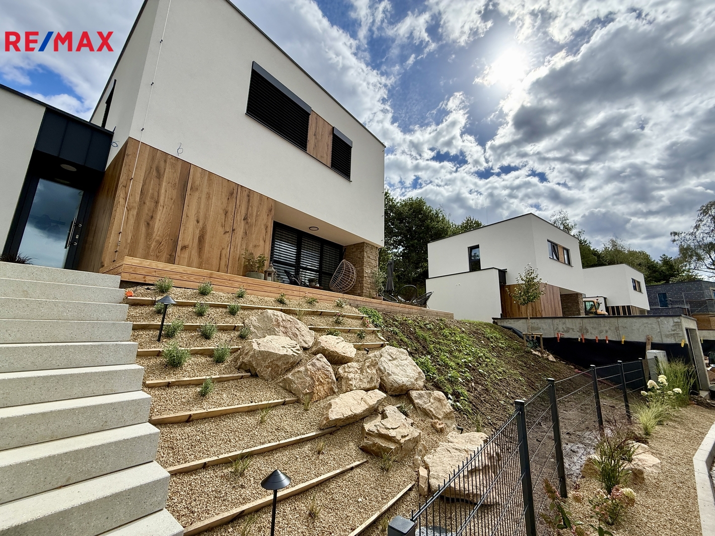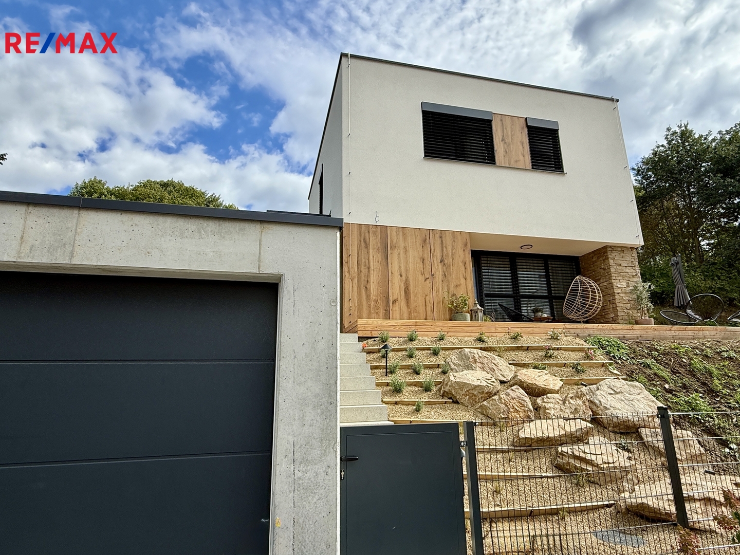 Exteriér domu vytváří harmonický dojem, který vás okouzlí svou pečlivě promyšlenou souhrou detailů - předzahrádka ozdobená okrasnou zelení, solitérním stromem, kameny i osvětlením. Betonová dlažba a pískované schody vytvářejí estetický vstup do domu. Žulová kostka u vjezdu na park. stání je odolná a nadčasová, stejně jako propustná betonová dlažba, která efektivně odvádí vodu. Svařovaný plot na bočních stranách a zadní části pozemku poskytne nejen soukromí, ale i bezpečí. Garáž je vybavená sekčními vraty a třífázovou zásuvkou.