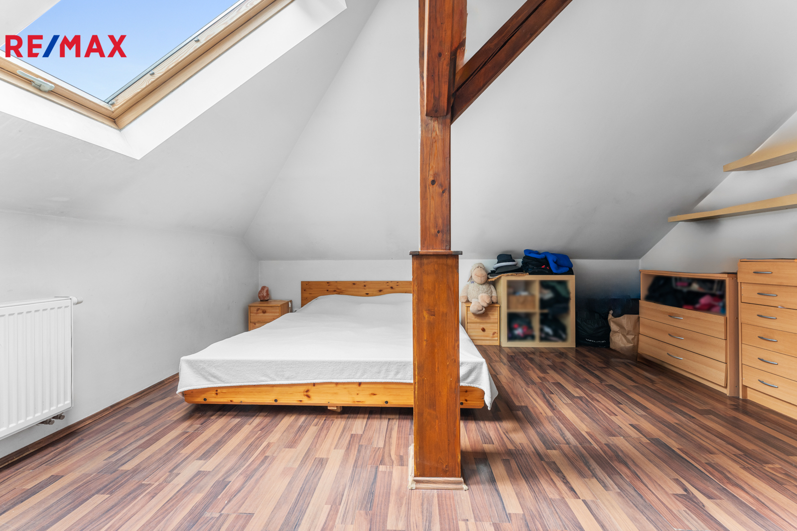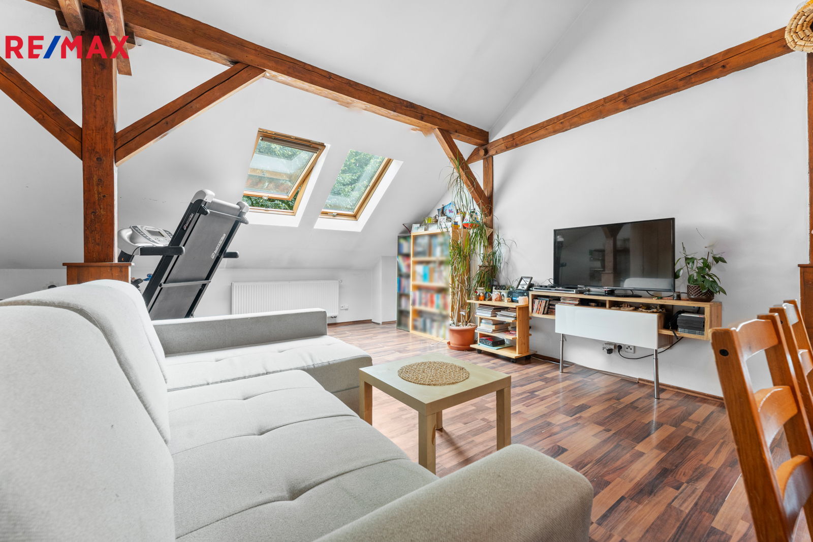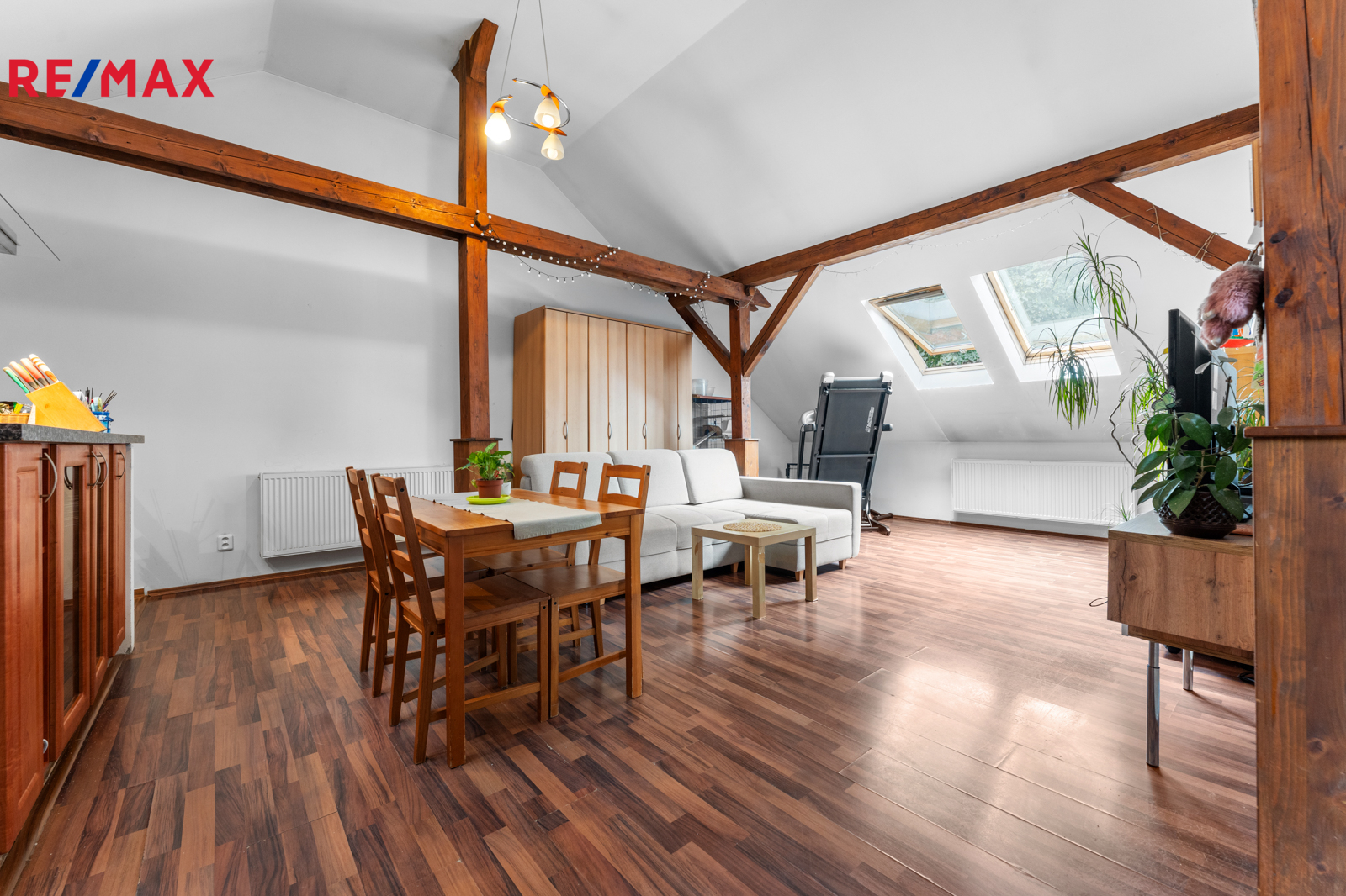 Podkroví (3+kk): chodba, koupelna s rohovou vanou a WC, komora, 2 pokoje, obývací pokoj s kuchyňským koutem (102,91 m²)