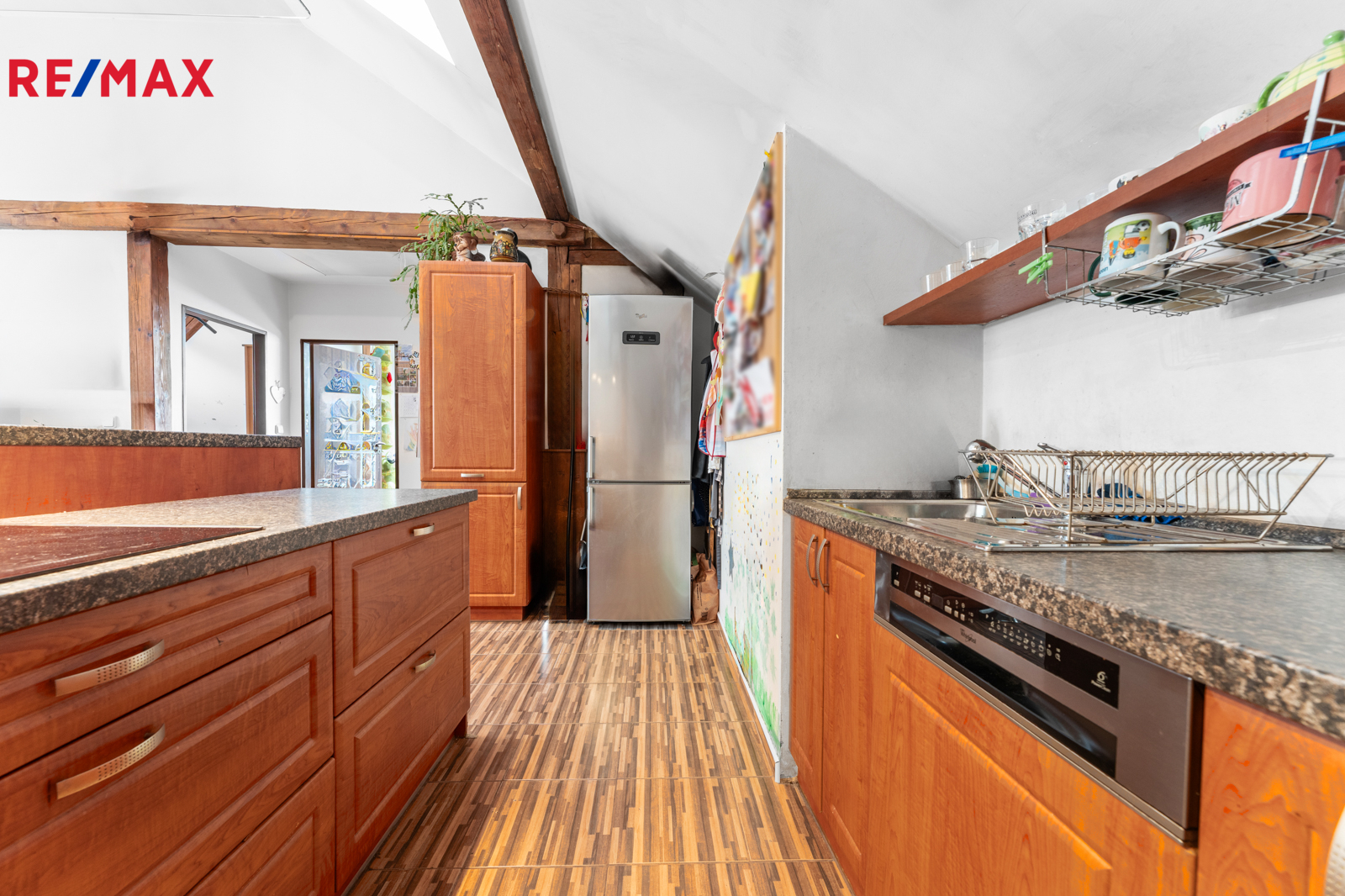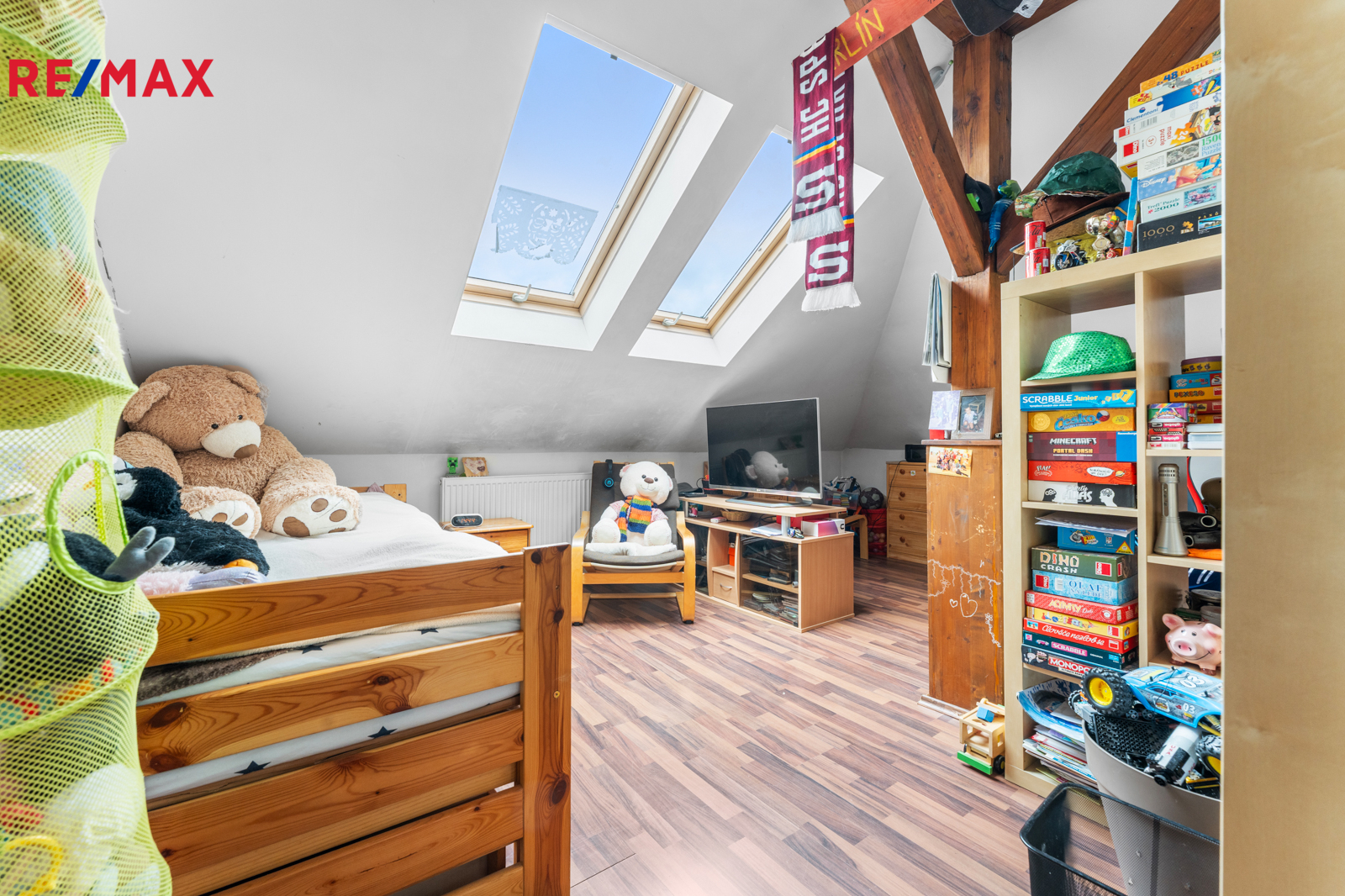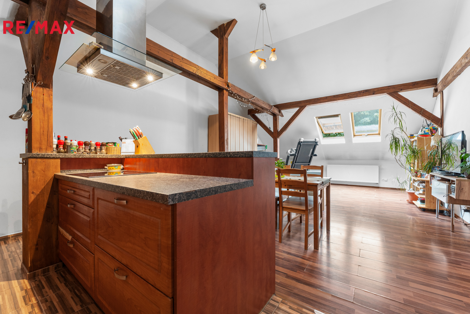 Podkroví (3+kk): chodba, koupelna s rohovou vanou a WC, komora, 2 pokoje, obývací pokoj s kuchyňským koutem (102,91 m²)