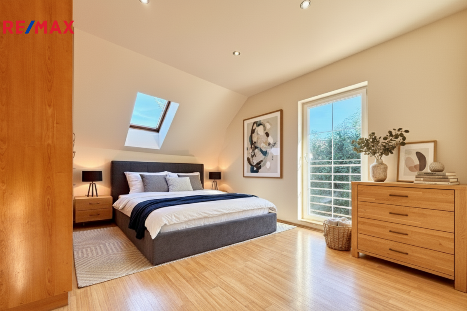 Promyšlená dispozice: 5+kk s možností vytvořit další pokoj díky šatně, navíc vytápěná půda s balkónem o velikosti 29 m².