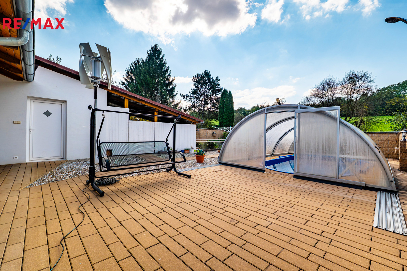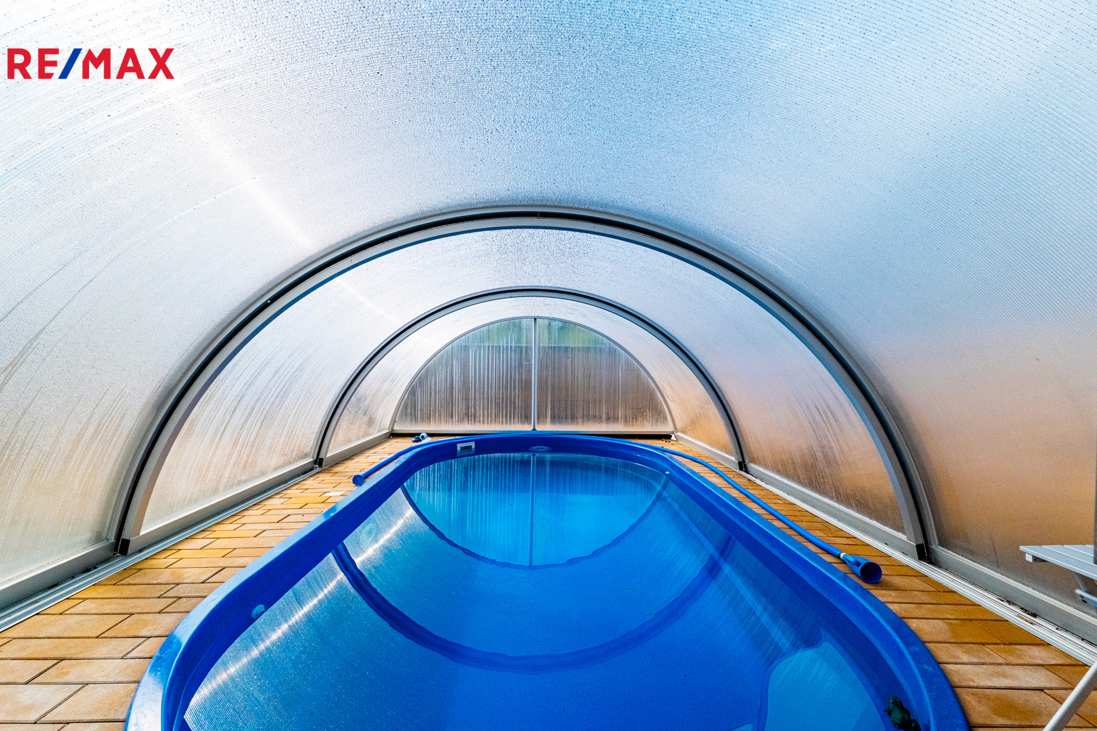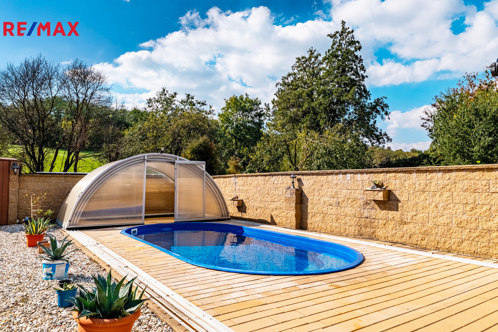 • Dlážděný dvůr orientovaný na jihozápad s bazénem se slanou vodou a posuvným zastřešením
