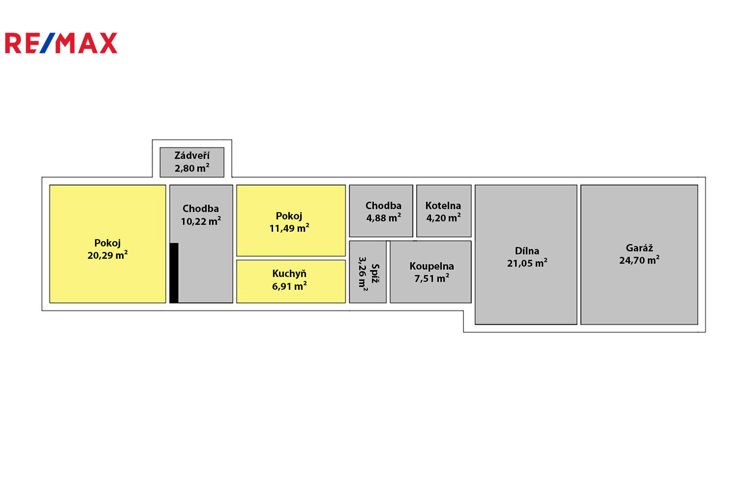 Dispozice zahrnuje obývací pokoj 20,29 m², kuchyň 6,91 m² a spíž 3,26 m² pro uskladnění potravin, dva pokoje 11,49 m² a 10,22 m², koupelnu s WC 7.51 m² a kotelnu 4,20 m². Součástí domu je prostorná garáž 24,05 m² pro pohodlné parkování automobilu a praktická dílna 21,05 m² pro kutily nebo uskladnění nářadí.